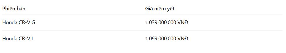 1.Giá bán Honda CR-V 2026 phiên bản G và L