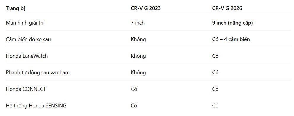 Nhìn vào bảng so sánh có thể thấy CR-V G 2026 được nâng cấp thêm nhiều công nghệ an toàn và tiện ích hơn so với phiên bản 2023, giúp tăng trải nghiệm sử dụng cũng như khả năng hỗ trợ người lái.
